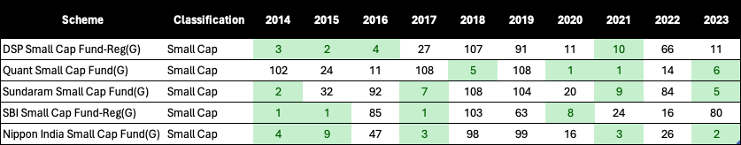 Surprisingly, amidst the unpredictability, one standout emerged: Nippon India Smallcap, which featured among the top 10 ranking schemes five times in the last decade. The remarkable consistency begs further examination, perhaps shedding light on exceptional fund management practices.