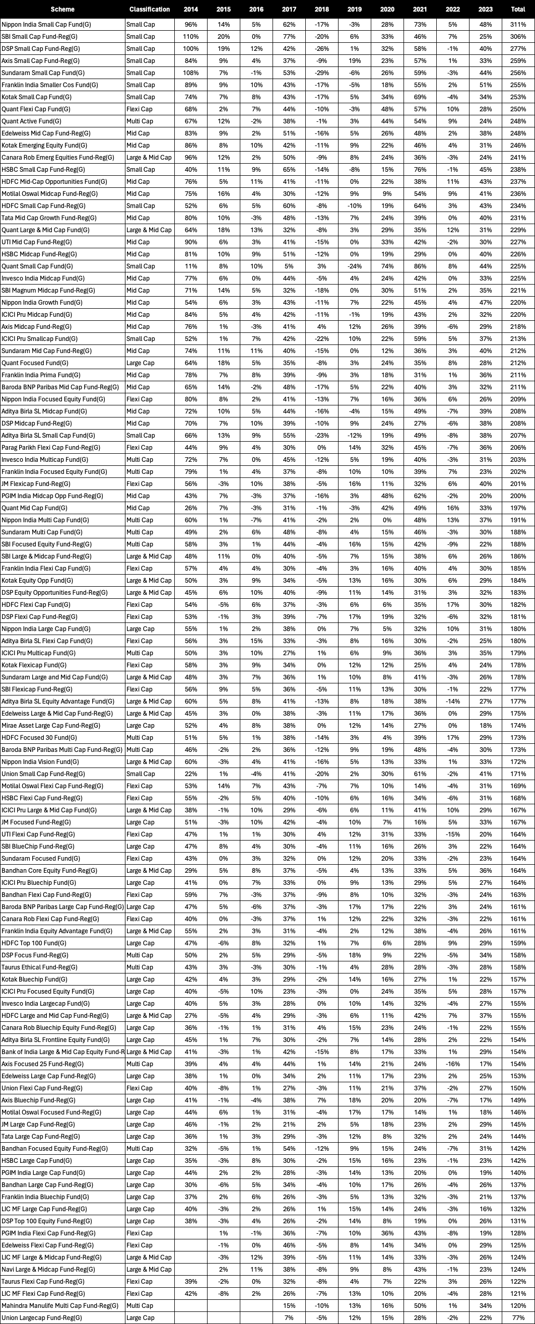 I commenced by scrutinizing funds with at least a decade of NAV data. Out of 108 distinct equity growth schemes, merely 54 had secured a top 10 spot at least once in the past decade (CY14-23). However, a mere 5 funds managed to maintain a top 10 position four times or more. This underscores the inherent risk of relying solely on past performance to guide investment decisions.