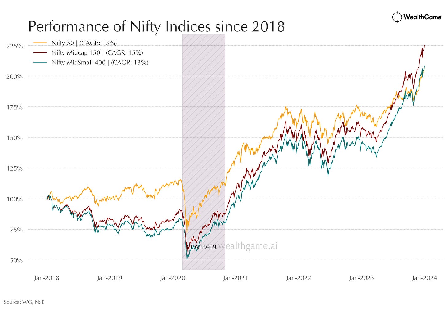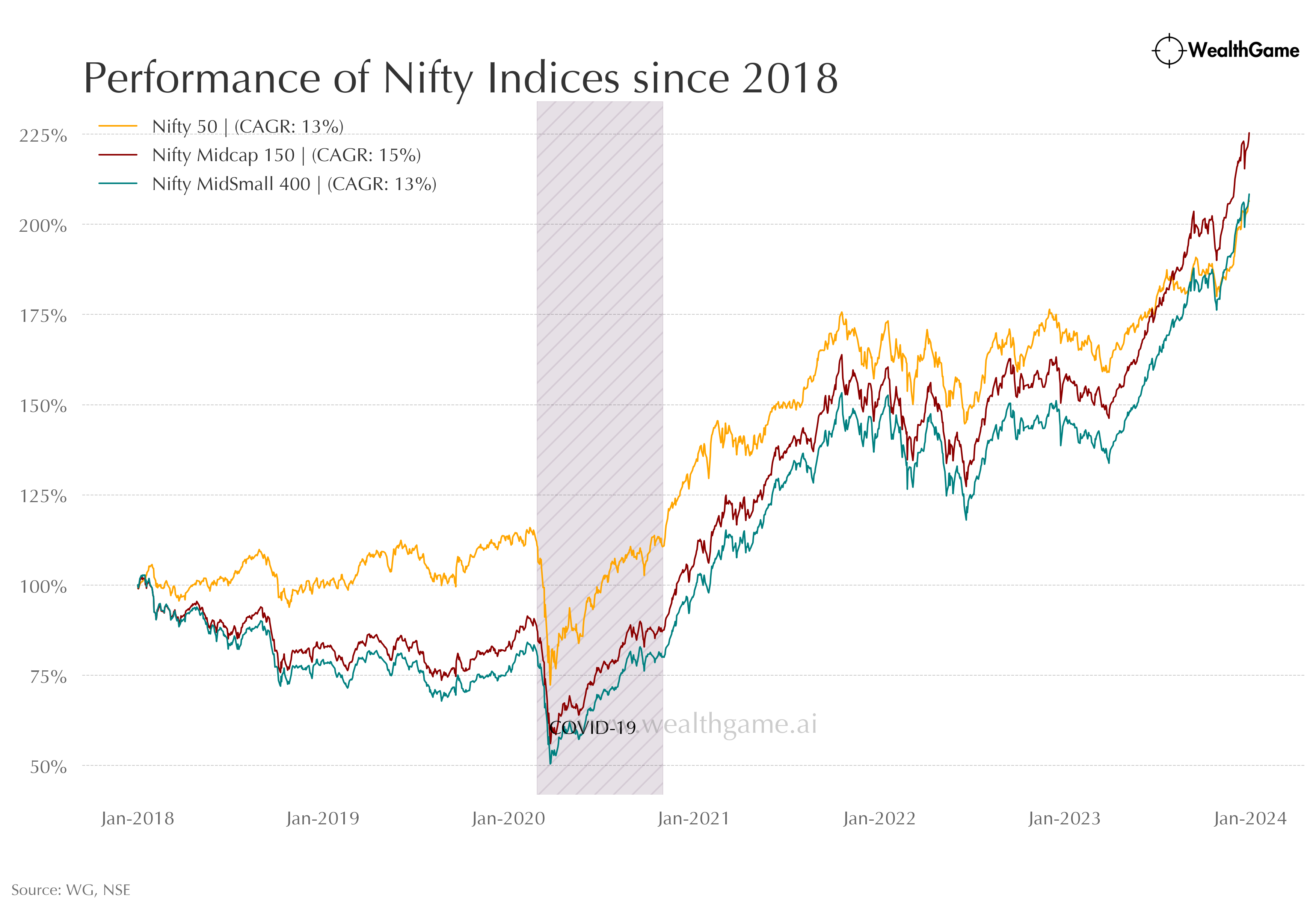 Let's be candid: I too have my biases. I have always advocated for an equal-weighted strategy encompassing Nifty 50, Nifty Midcap 150, and Nifty MidSmallcap 400 Indices. Why? Because in a landscape fraught with uncertainty, relying solely on predictions of economic or psychological variables feels akin to gambling. Hence, I propose a solution rooted in probabilities rather than absolutes.